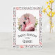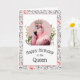 Este cartão de aniversário único apresenta um flamingo branco, cor-de-rosa, vestido com uma capa esfregada vestindo uma coroa joalhada. Ao redor de flores e estátuas históricas, o design é enquadrado em um padrão floral rosa e elegante bege. O texto do lado de fora é "Parabéns à Rainha". O texto da dentro é "Todo dia você brilha, mas hoje, você REGRA!" Você pode editar este texto com seu próprio texto ou ordená-lo como escrito. Este cartão está disponível como cartão impresso ou download digital!