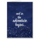 Simples contudo aperfeiçoe para eventos novos dos beggings como graduações, bebê novo, ou os newlyweds, este céu nocturno estrelado azul e branco "e assim, a aventura começam" o cartão são a maneira perfeita de oferecer palavras de incentivo e de amor. A tipografia interna pode ser mudada a seu dizer desejado ou a supressão a entregar escreve sua própria mensagem especial.