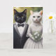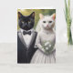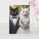 Dois gatos estão vestidos de casado um com um smoking e outro com um vestido de noiva segurando um buquê