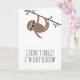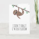 Cartão de aniversário engraçado com uma preguiça pendurada num galho com folhas verdes acima do texto "Eu não esqueci. Sou apenas lento" em letras encantadoras. Se você abre o cartão, você vê a mesma preguiça agora em roupas coloridas cor-de-rosa e amarelas, vestindo um chapéu de bolinhas, e cercado por confetti em cores iguais.