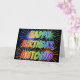 Este design de cartões de aniversário divertidos, vibrantes e multicoloridos apresenta a mensagem "HAPPY BIRTHDAY", e o nome comum "ANTONIO" com as letras que têm um espectro colorido de arco-íris, como um padrão de coloração gradiente. O plano de fundo da frente também apresenta um padrão colorido inspirado pela aparência de fogos de artifício que explodem. O dentro apresenta uma mensagem de saudação personalizada, ou talvez possa ser apagado e deixado vazio se uma mensagem for escrita manualmente. Um cartão de saudação como este pode ser uma maneira divertida de celebrar o aniversário de alguém chamado Antonio. [~Z0000350]