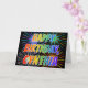 Este vibrante, multicolorido e divertido design de saudação de aniversário apresenta a mensagem "HAPPY BIRTHDAY" e o nome comum "CYNTHIA" com as letras que têm um espectro colorido do arco-íris como um padrão de colorir gradiente. O plano de fundo da frente também apresenta um padrão inspirado em fogos de artifício coloridos. O dentro apresenta uma mensagem de saudação personalizada, ou talvez possa ser apagado e deixado o vazio se uma mensagem for escrita manualmente. Um cartão de saudação como este pode ser uma maneira divertida de enviar uma mensagem de aniversário personalizada a alguém chamado Cynthia. [~Z0000350]