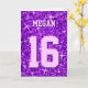 Cartão de saudação com um design moderno impresso com estrelas espalhadas sobre um padrão estilizado de "aparência sequencial" e sua escolha de nome e idade escrita em tons de roxo e lilás. Um design personalizável para você personalizar com seu próprio texto, imagens e ideias. Por favor, note que esta é uma imagem digital impressa. O produto não brilha ou contém cinzas ou sequências reais.
