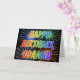 Este vibrante, multicolorido e divertido design de saudação de aniversário apresenta a mensagem "FELIZ ANIVERSÁRIO" e o nome comum "JOANNA" com as letras que têm um espectro colorido do arco-íris como um padrão de colorir gradiente. O plano de fundo da frente também apresenta um padrão inspirado em fogos de artifício coloridos. O dentro apresenta uma mensagem de saudação personalizada, ou talvez possa ser apagado e deixado o vazio se uma mensagem for escrita manualmente. Um cartão de boas-vindas como este pode ser uma maneira divertida de celebrar o aniversário de alguém chamado Joanna. [~Z0000350]
