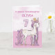Um pônei rosa doce, assim como sua neta, está dançando com o número sete! Detalhes com aparência dourada estão entrelaçados em sua crina e cauda. Cartão perfeito para desejar um feliz aniversário de 7 anos à sua neta! Personalize este cartão com o nome da sua neta.