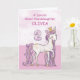 Um doce pônei rosa como a sua bisneta está dançando com o número um! Detalhes com aparência dourada estão entrelaçados em sua crina e cauda. Cartão perfeito para desejar feliz aniversário de 2 anos à sua bisneta! Personalize este cartão com o nome da sua bisneta.