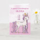 Um lindo pônei rosa como a sua neta está dançando com o número um! Detalhes dourados estão entrelaçados na crina e na cauda. Cartão perfeito para desejar feliz aniversário de 1 ano para sua neta! Você pode personalizar o nome neste cartão.