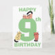 Cartão de aniversário bonito, divertido, nono (9º), com um grande número nove na cor verde. Um gatinho de rabisco está sentado em cima do número e dois gatinhos de rabisco estão sentados na base do número, cada gato é único com uma cor diferente e em uma posição diferente. Por cima e por baixo dos gatos, encontram-se as palavras Happy (no topo da carta) e Birthday (no fundo da carta) em texto verde. Dentro no cartão você encontrará gatos ainda mais bonitinhos com um modelo para adicionar sua mensagem de aniversário e, finalmente, outro gato rabisco na parte de trás do cartão.