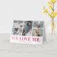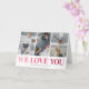 Mostre à sua mãe o quanto você se importa com este moderno e exclusivo cartão do Dia das Mães. Não é um cartão de felicitações típico, este inclui cinco das suas fotos familiares favoritas para inserir, tornando o cartão mais significativo e personalizado. Ele também apresenta um título clássico 'Nós Amamos Você' em ombre pink exibido contra um fundo branco. Sua mãe ficará verdadeiramente emocionada quando vir a mensagem especial da sua família, em um cartão que preserva as memórias ano após ano.