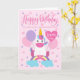 Um adorável unicórnio sentado num arco-íris cercado por balões e confete. No topo do cartão figuram as palavras "Parabéns", enquanto o balão em forma de coração tem as palavras "sete hoje". A carta perfeita para o aniversário de 7 da sua doce neta de "plural" você!