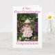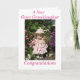Bonecinha linda em um belo jardim e a mensagem "Um novo excelente, Parabéns da neta"