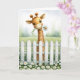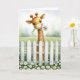 Uma girafa brincalhona espiando por cima de uma cerca branca com uma margarida na boca.