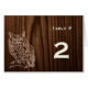 A madeira marrom escura rica parece um cartão de tenda de número de mesa recepção de casamento. Gráficos de uma coruja sentada em um galho, decoram o canto inferior esquerdo da placa. O texto de um marfim cremoso está pronto para personalizar cada mesa na sua recepção. Produtos correspondentes disponíveis.