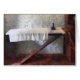 Design por Susan Savad -- Uma das tarefas em uma casa do Victorian estava passando. Aqui a tábua de passar a ferro setup em uma sala ensolarada na frente de uma parede stuccoed com um ferro antiquado setup tudo pronto para começar passar as folhas.