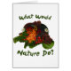 Uma bela e colorida imagem de uma cornucópia rústica do jardim rural, com morangos vermelhos, mirtilos, uvas roxas, cenouras laranja brilhantes, e mais, enquadrada pelas palavras, O que a natureza faria? Perfeito para mercados de fazendeiros, orgânicos, compro ou qualquer cenário rústico.