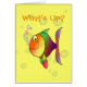 O que é acima dos peixes coloridos e borbulha cartão. Multi peixes engraçados da cor que fundem bolhas cor-de-rosa, com bolhas mais transparentes no fundo. Que está acima? em um cartão amarelo. Adicione seu próprio cumprimento para dentro, ou suprima do fraseio interno e deixe o vazio.
