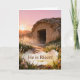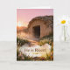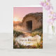 Um caminho muito trilhado leva a um túmulo de pedra que está vazio na manhã de Páscoa, enquanto o sol nasce sobre as colinas. O texto "Ele Ressuscitou" na frente nos lembra de Sua ressurreição e nossa salvação. Bela imagem cristã.