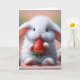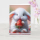 Um coelho branco bonito está segurando um morango grande entre suas patas para te obrigado. O texto pode ser alterado.