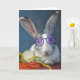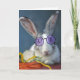 Obrigados para o presente, cartão de saudação em papel com um coelho vestindo tons redondos em violeta e soltando um presente de couve-flor e cenouras. Arte, imagem e direitos de autor versos © Shoaff Ballanger Studios, 2022.