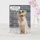 Ouro recuperador vestindo um bigode engraçado e uma máscara de óculos em uma parede de tijolos de cinza e chão de madeira com bolha de fala para aniversário humorístico. O texto é editável.