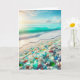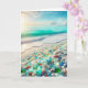 Cartão de aniversário. Belo vidro colorido numa praia branca arenosa com ondas turquesas na cena oceânica.