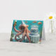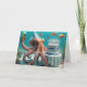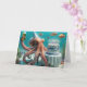 Um polvo vestindo uma festa que segura uma cerveja e se senta ao lado de um bolo de aniversário debaixo d'água. O texto pode ser alterado.