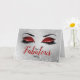 O Cartão de Aniversário Padrão Olhos Brilhantes Fabuloso Rubi Vermelho apresenta um par de pálpebras grandes com sombra para olhos brilhante Rubi Vermelho, delineador com efeito diamantado e cílios pretos longos sobre um fundo com efeito brilhante prateado. A palavra 'fabuloso' é escrita em roteiro numa cor Rubi Vermelho correspondente com uma pequena coroa de rainha prateada pendurada no topo do laço no 'L'. 'Tenha um' e 'Aniversário' estão escritos em roteiro preto menor acima e abaixo da palavra fabuloso. O interior do cartão é branco e na parte de trás interna há uma pequena coroa de rainha prateada. Na parte de trás externa, o fundo é o mesmo efeito brilhante prateado da frente e um pequeno par dos mesmos olhos brilhantes Rubi Vermelho e cílios pretos