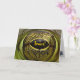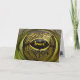 Esta assustadora carta de Halloween apresenta um fechamento de um olho de sapo verde. Sua íris é um incrível padrão abstrato de ouro e amarelo. O aluno preto puro e oval no centro reflete árvores a distância.Mais sapo estão espreitando dentro. Todo texto pode ser personalizado ou removido.