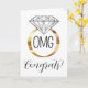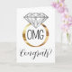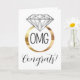 Este cartão de saudação diz OMG Parabéns! na frente, junto com um gráfico de anel de noivado de diamante branco em ouro e uma mensagem sincera e personalizável no dentro.