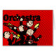 Fundo vermelho com esboços pretos finos de círculos concêntricos atrás de um grupo de jogo dos músicos e da palavra "orquestra" acima.