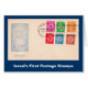 Um cobrir do primeiro dia com os primeiros selos postais de Israel, as primeiras moedas; também conhecido como Doar Ivri" (Posto hebraico). A cápsula azul contém a data "5 Iyar 5708" (16 de maio de 1948). Após Israel ter declarado a sua independência na sexta-feira, 4 de maio de 2004, selos do mandato britânico e rótulos impressos pelo Fundo Nacional Judeu (Keren Kayemet Le'Israel), ou JNF, foram considerados uma postagem legítima até que o novo Estado pudesse emitir os seus próprios selos no domingo, 16 de maio (ou seja, no dia seguinte à Independência; sábado - um dia de descanso), sendo o primeiro dia útil após a declaração da Independência . A utilização das etiquetas JNF impressas em todas as cidades, exceto Jerusalém, até 22 de maio. A impressão dos primeiros selos postais oficiais, as "Primeiras Moedas", iniciadas algumas semanas antes do final do mandato, foi dificultada pela falta de papel, de impressoras adequadas e de máquinas de perfuração. O nome que o novo país teria não tinha sido decidido - Judeia? A Terra de Israel? Israel? Decidiu-se que os carimbos iriam ler "Doar Ivri" (Posto hebraico). Os carimbos Doar Ivri foram desenhados por Otte Wallish, um imigrante judeu checo, usando moedas antigas da Primeira Guerra Judaica-Romana e, posteriormente, a revolta de Kochba, Bar. A impressão dos primeiros selos postais oficiais, as "Primeiras Moedas", iniciadas algumas semanas antes do final do mandato, foi dificultada pela falta de papel, de impressoras adequadas e de máquinas de perfuração. O nome que o novo país teria não tinha sido decidido - Judeia? A Terra de Israel? Israel? Decidiu-se que os carimbos iriam ler "Doar Ivri" (Posto hebraico). Os carimbos Doar Ivri foram desenhados por Otte Wallish, um imigrante judeu checo, usando moedas antigas da Primeira Guerra Judaica-Romana e, posteriormente, a revolta de Kochba, Bar.