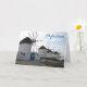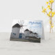 Um cartão de boas-vindas com uma fotografia dos famosos moinhos de vento na ilha de Mykonos, Grécia. A foto foi tirada num dia ensolarado de inverno, e não há pessoas na foto - apenas os moinhos de vento.