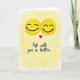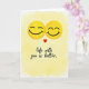 This greeting card shows two bright yellow emoji faces near the top, gently overlapping as if they’re leaning into each other. Both have closed eyes and soft smiles, giving them a calm, happy look. A small red heart sits between them, right where their faces meet, hinting at love and closeness ❤️. The background looks like a light watercolor wash in warm yellow that fades into white around the edges, keeping the focus on the couple. Near the bottom, the card says “life with you is better” in a flowing script style that feels personal and handwritten. The text is dark and easy to read, sitting centered below the emojis like a simple, heartfelt note 💌. Altogether it feels sweet and steady, like a quiet moment shared with someone you care about 🍫. Hope it helps you share your Valentine’s Day feelings with someone special.