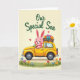 This card shows a cheerful bunny 🐰 sitting in the driver’s seat of a bright yellow, vintage-style compact car, smiling with rosy cheeks and long pink ears tilted as if enjoying the ride. The car sits across the lower middle of the scene on a pale cream background, with rounded details that give it a cozy, friendly look. On top, a wooden roof rack carries a full bundle of flowers in purple, orange, and teal, like a sweet surprise being delivered. A strip of green grass runs along the bottom edge, dotted with small blossoms that echo the colors above and add a gentle garden setting 🌷. Near the bunny, tiny red hearts float in the air, hinting at affectionate pride and a close family bond. Centered above the illustration, the words “Our Special Son” appear in flowing green lettering that stands out clearly against the light background. The yellow car has softly shaded curves, dark wheels, and a simple window shape framing the bunny’s bright, open grin.