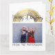 Esta bela design caligráfica apresenta um arco-íris de ouro clássico e um texto de Feliz Natal com corações para personalizar com o seu nome de família e a sua fotografia! Por favor, note que o arco-íris é uma textura de foto impressa e não uma folha real.