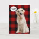 Ouro recuperador com óculos roxos pretos em fundo de xadrez de búfalo vermelho e preto para humor de aniversário.