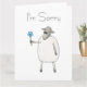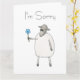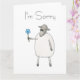 Uma fotografia de uma ovelha fofa segurando uma flor azul, e ele está oferecendo a flor como se fosse um gesto de desculpas para pedir desculpas. Esta imagem impressa foi originalmente uma ilustração criada com tintas aquarelas e tinta. O texto deste cartão diz: "Desculpe.