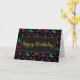 Um cartão de aniversário brilhante e ousado. Projetado com um padrão elegante com ilustrações gráficas de borboletas em muitas cores brilhantes, contrastando muito bem no fundo preto. Os florais, os prigos e as folhas do trigo, por exemplo, são um pouco carinhosos.