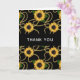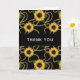 Cartões de agradecimentos com um padrão elegante e na moda. Bonito girassóis amarelos e folhas verdes cercadas por delicadas cadeias de ouro. Fundo preto.
