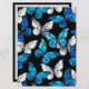 Borboletas realistas, azuis e brancas têm um padrão uniforme em fundo preto.