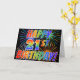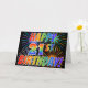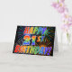 A frente deste design de carta de saudação, vibrante e divertida, que chama a atenção, apresenta um padrão colorido inspirado em fogos de artifício celebratórios, juntamente com a mensagem "ANIVERSÁRIO DE 21 ANOS HAPPY!", tendo um arco-íris multicolorido como um padrão de gradiente, num fundo preto colorido. O dentro apresenta uma mensagem de saudação personalizada, ou talvez possa ser apagado e deixado vazio se uma mensagem for escrita manualmente. Um cartão de boas-vindas como este pode ser uma maneira divertida e feliz de reconhecer o vigésimo primeiro aniversário de alguém. [~Z0000355]