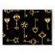 Padrão perfeito de chaves antigas, douradas e silhuetas em fundo preto.