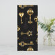 Padrão perfeito de chaves antigas, douradas e silhuetas em fundo preto.