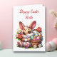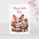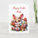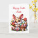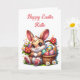 Cartão de coelhinho de Páscoa bonito com uma página de coloração de bônus no dentro. Coelhinho de Páscoa, ovos e cartão de cesta para crianças. Adicione o nome na área de personalização.
