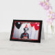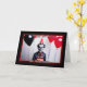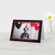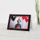 Este cartão é uma saudação de aniversário com um tema de Halloween. Ele apresenta um palhaço assustador vestindo um chapéu de festa vermelho e gravata de arco, segurando um bolo de aniversário com velas vermelhas. O palhaço tem um sorriso sinistro e uma maquiagem facial exagerada, típica de um personagem assustador de Halloween. O fundo tem balões negros e vermelhos com galerias coloridas. O cartão é enquadrado com uma borda riscada vermelha e preta.