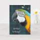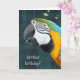 arara colorida sobre fundo de xadrez com bolhas de aniversário humorístico