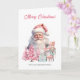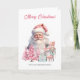 No maravilhoso cartão de Natal, um velho Papai Noel e um pirata-prego ficam entre presentes envoltos em papel azul com árvores de Natal cor-de-rosa