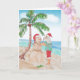 Pintura em aquarela do Papai Noel com uma camisa de praia cheia de flamingos construindo um boneco de neve de areia na praia. Ótimo para snowbirds, pessoas que moram na Flórida ou em qualquer comunidade costeira. Feliz Natal cartão de praia engraçado.