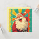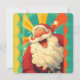 Uma cena vibrante e animada se desenrola com um alegre Papai Noel no centro, sua risada ecoando pelo ar. A câmera faz um zoom dinâmico, capturando os detalhes de seu rosto expressivo e barba fofa. Raios de cores brilhantes explodem por trás dele, criando uma atmosfera festiva. O fundo apresenta padrões geométricos divertidos, realçando o clima alegre. A iluminação é quente e convidativa, com uma paleta de vermelhos, verdes e amarelos, evocando uma sensação de alegria natalina.