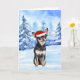 Este cartão de Natal apresenta um retrato de aquarela de um chihuahua vestindo um chapéu de santa em uma cena de neve.